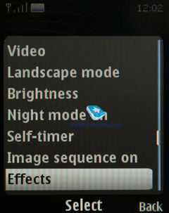 Podržana su tri podešavanja JPEG kompresije: basic, normal i high. Govoreći o drugim opcijama možete podesiti zvuk pri fotografisanju (on/off), iskoristiti prednosti 8x digitalnog zuma ili odabrati mesto na kojem ćete sačuzvati svoje fotografije, modifikovati podešavanje uravnoteženja belog, ISO nivo itd. Efekti se mogu primeniti na sve snimljene fotografije prema tome nije bitno da li ćete ih primeniti pre fotografisanja ili ne – sve je na vama. Kamera telefona omogućava primenu sledećih efekata - Greyscale, Sepia, Negative.